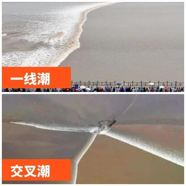 交叉潮:由于長期的泥沙淤積,在江中形成一個沙洲,傳來的潮波分成兩股,即東潮和南潮,兩股潮頭在繞過沙洲后,就像兩兄弟一樣交叉相抱,形成變化多端、異常壯觀的交叉潮,呈現出"海面雷霆聚,江心瀑布橫"的壯觀景象。