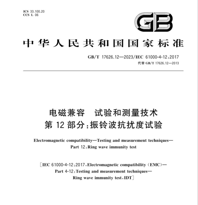 GB/T17626.12-2013IEC 61000-4-12:2006《電磁兼容 試驗和測量技術 振鈴波抗擾度試驗》在眾多電磁兼容測試項目中,振鈴波抗擾度試驗是評估電子設備抵抗電磁干擾能力的重要一環。振鈴波抗擾度試驗是指在電磁環境中,電子設備能否正常工作而不受外界振鈴波的干擾。振鈴波是一種高頻脈沖信號,具有很高的幅度和較窄的脈沖寬度,能夠對電子設備產生較大的干擾。