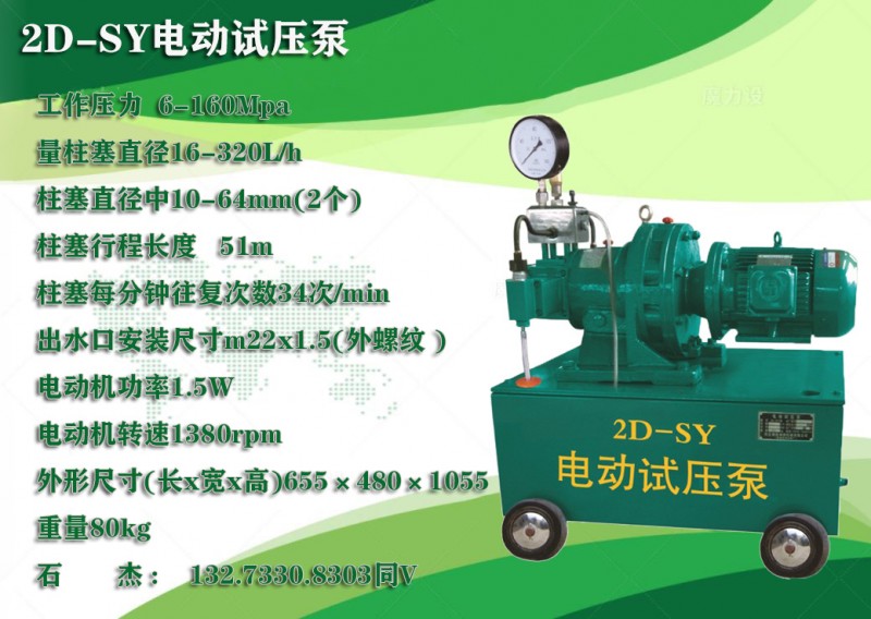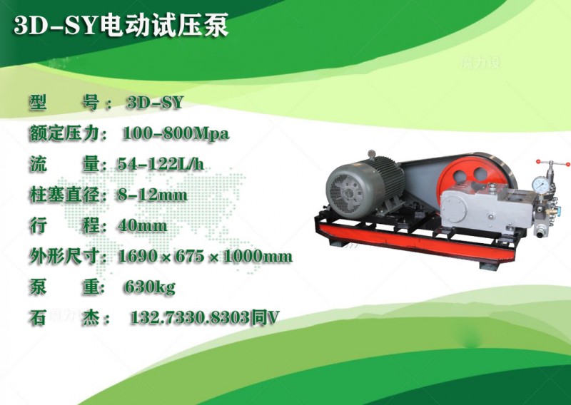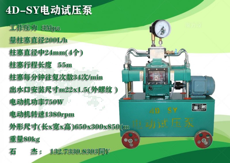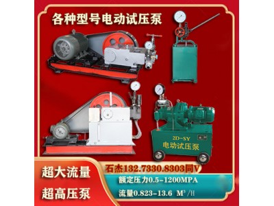 電動(dòng)試壓泵的型號(hào)和功率會(huì)因生產(chǎn)廠家和具體用途而有所不同。以下是一些常見(jiàn)電動(dòng)試壓泵的型號(hào)及對(duì)應(yīng)的功率參數(shù)示例,供你參考: