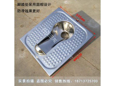 不銹鋼防滑帽蹲便器由不銹鋼板,盆,門擋組成,外觀華麗,亮潔尤其上面協調的圓形帽更起到了決定性的防滑作用,當入廁后可能會有水噴濺,所有防滑一定要做好.