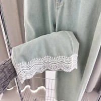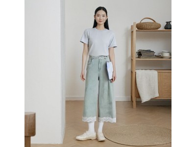 溫碧霞代言IRENENA服裝時(shí)尚百搭顯瘦蕾絲藍(lán)色闊腿牛仔褲