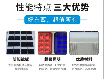 太陽能爆閃燈:太陽能交通標志是交通標志牌的一種,由標志面、標志底板、太陽能電池板、控制器、發光單元(LED)組成,用文字與圖案傳遞警告、禁令、指示信息給司機和行人,用以管理道路交通的安全設施。白天太陽能電池板吸收太陽光,把太陽能轉化成電能,儲存在儲能器件中,晚上,儲能器件中的電能自動轉化成光能(通過光電開關控制),通過LED發出亮光來勾畫圖案輪廓,傳達交通信息。它給道路使用者以確切的道路交通信息,保障道路安全。