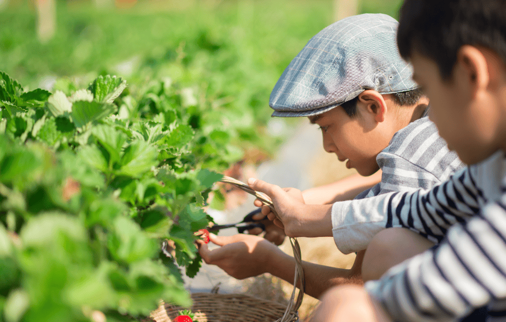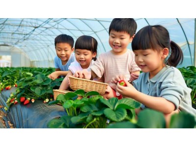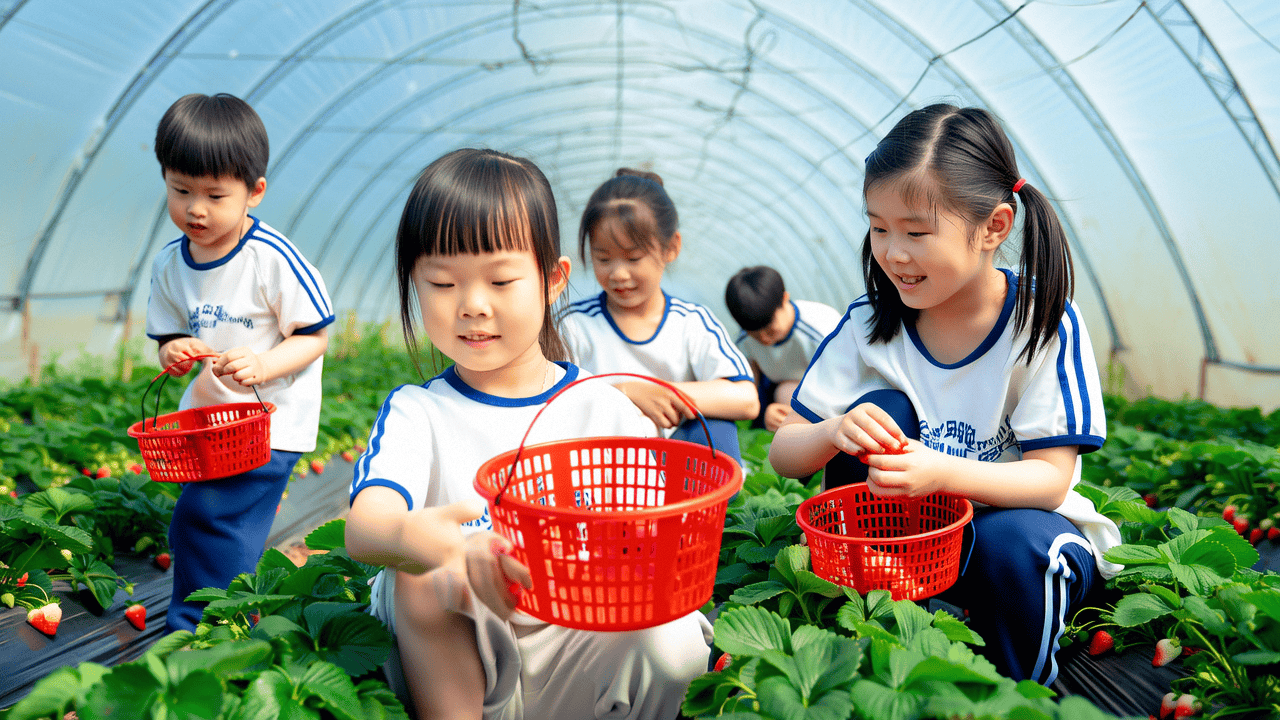 在草莓大棚中,孩子們親手采摘那些晶瑩剔透的草莓,體驗收獲的喜悅。他們在綠葉中尋找最大的草莓,互相分享采摘的樂趣,整個過程中充滿了歡聲笑語。