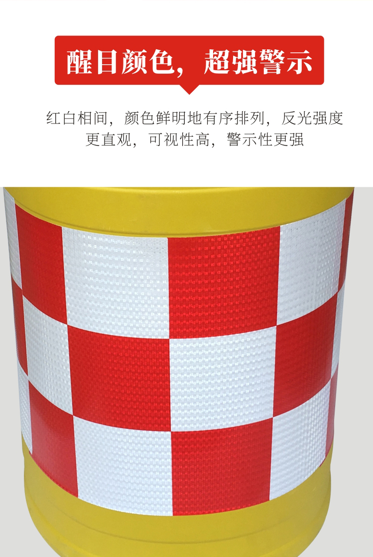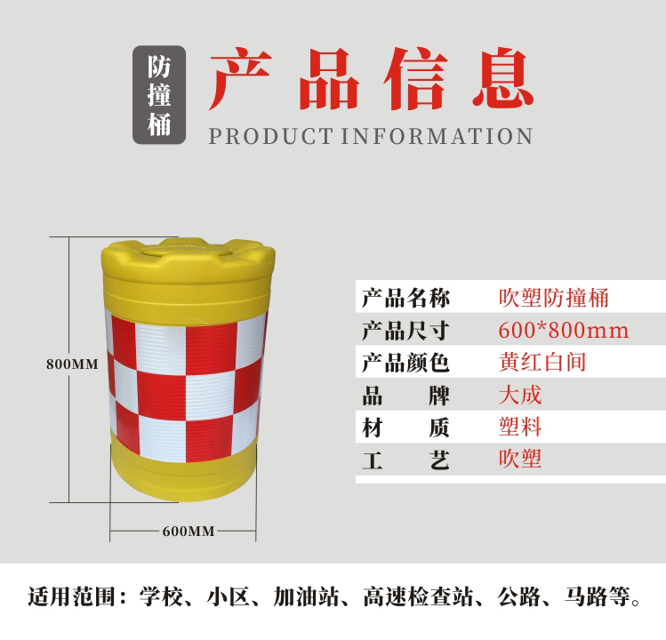 防撞桶主要設置在公路及城市道路上容易發生汽車與路中固定設施發生碰撞的部位,如:路的轉彎處,路中崗亭、收費站及高架路的進出口,停車場、小區、花園、加油站等等,起到隔離作用,防撞桶是用高彈性、高強度的改性塑料制成,當汽車與該設備碰撞時,能有效地減小沖擊力,因此,能顯著地降低車與人的損傷。 其表面貼有的反光膜,可以根據需要貼上指示標簽。
