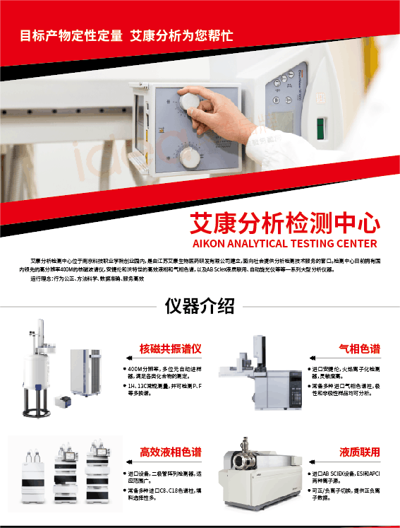 南京艾康全心分析檢測中心目前擁有國內(nèi)xian進的高分辨率400M的核磁共振波譜儀,全套Agilent系列的液質(zhì)聯(lián)用儀、氣質(zhì)聯(lián)用儀、高效液相儀、氣相色譜儀以及各種理化分析儀器等一系列大型分析儀器。